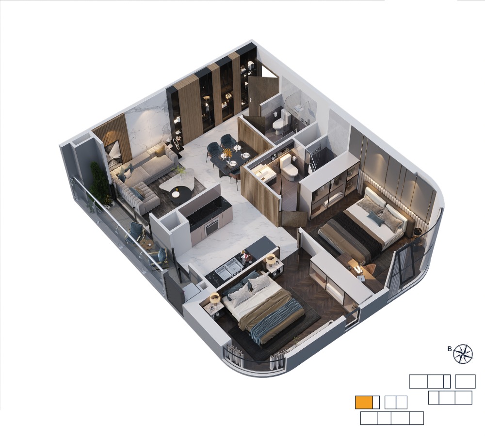 Căn hộ 2PN: Diện tích từ 79m2 – 83m2 ( căn góc hoặc căn thường) giá bán 6.85 tỷ - 7.92 tỷ/căn