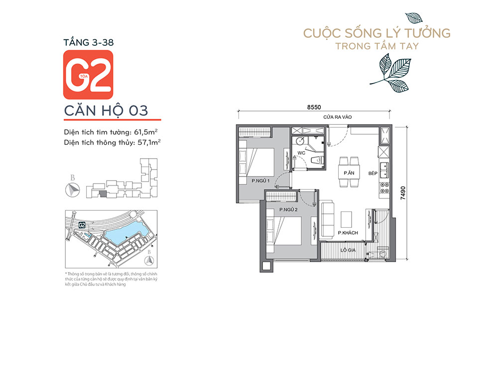 - Căn 2 ngủ : 14căn/sàn với diện tích từ 61,2-72,5m2