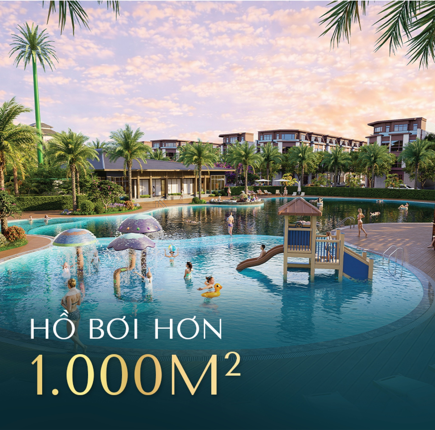 Song hành cùng đó là hệ thống hồ bơi quy mô hơn 1.000m², mang đến trải nghiệm thư giãn chuẩn resort ngay tại nơi ở. Không gian này không chỉ phục vụ nhu cầu cá nhân mà còn là điểm cộng lớn khi khai thác lưu trú, giúp nâng cao tỷ lệ lấp đầy và giá thuê.