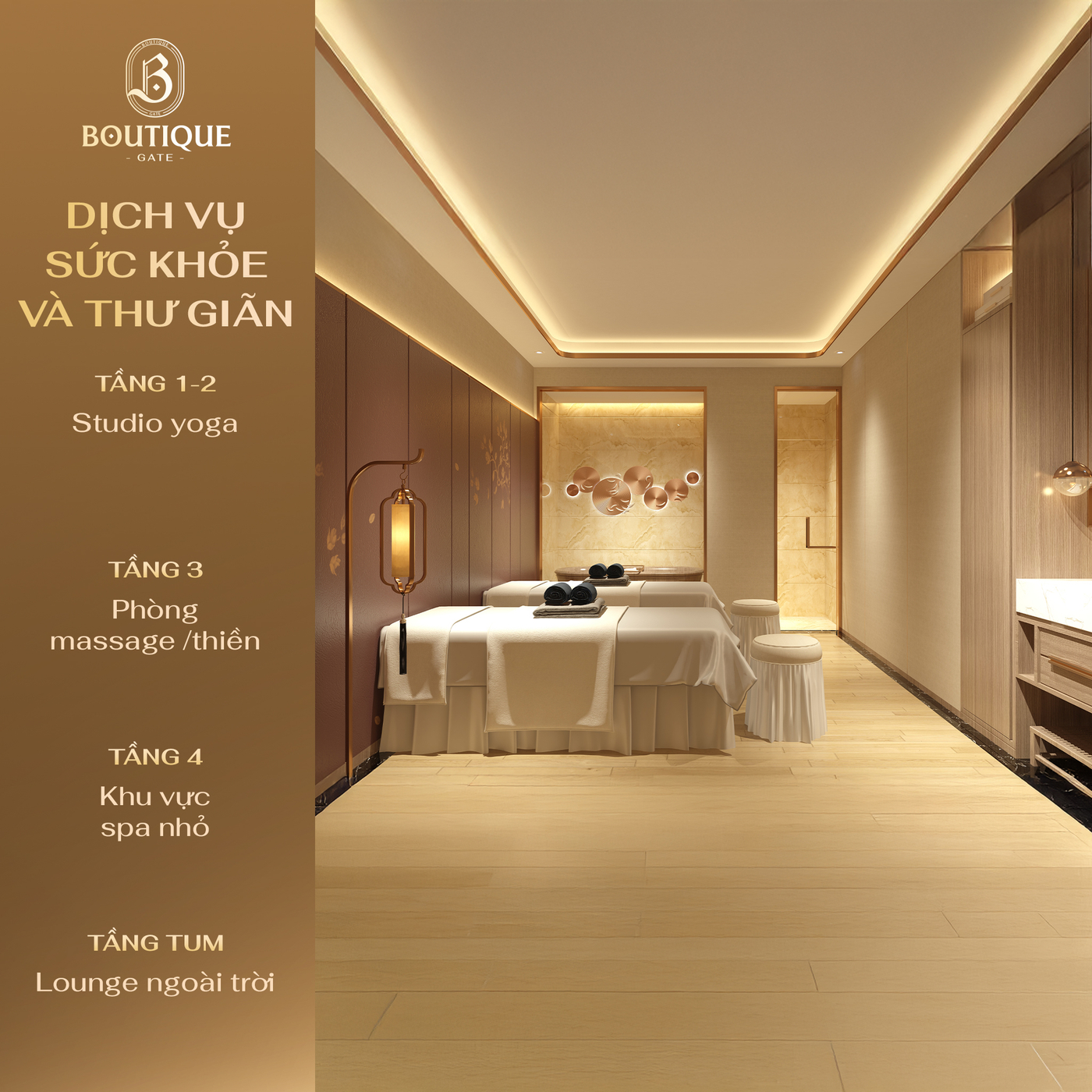 Các khu vực yên tĩnh, gần mặt nước và không gian xanh được quy hoạch cho các dịch vụ chăm sóc sức khỏe như spa, yoga hay trị liệu. Đây là xu hướng đang phát triển mạnh trong các đô thị hiện đại, khi người dân ngày càng quan tâm đến chất lượng sống và cân bằng tinh thần.