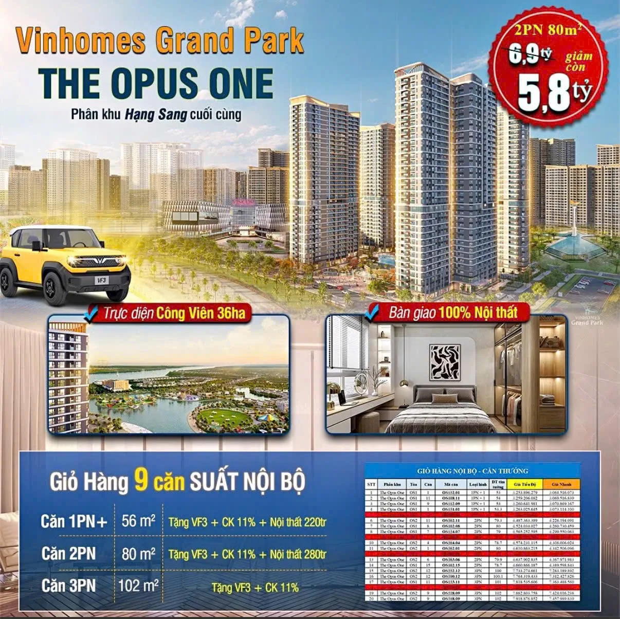 Giá bán chi tiết The Opus One - Vinhomes Grand Park