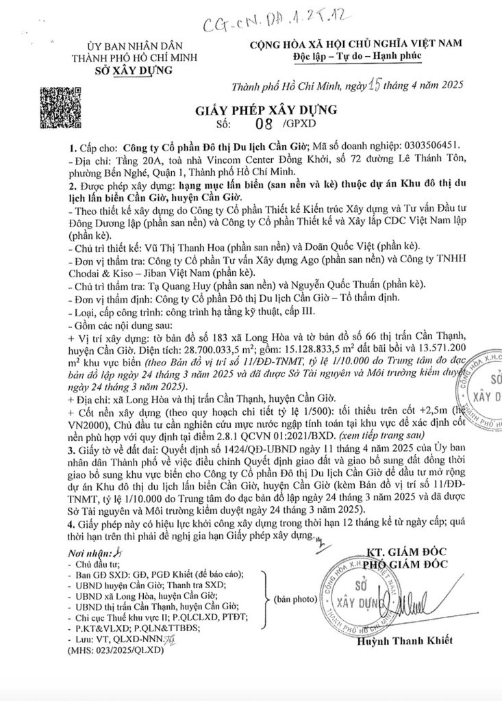 Giấy phép xây dựng: Dự án đã có giấy phép xây dựng cho các hạng mục lấn biển (san nền, kè) và hạ tầng kỹ thuật - giao thông.