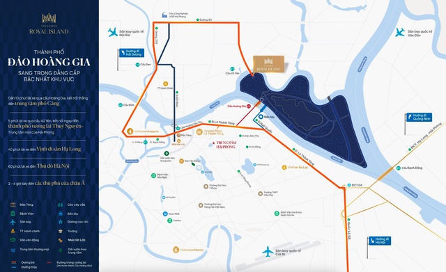 Một trong những điểm khác biệt của Vinhomes Royal Island là khả năng kết nối đa dạng bằng cả đường bộ, đường thủy và đường hàng không. Sự hiện diện của các sân bay quốc tế như Cát Bi, Vân Đồn và Nội Bài trong bán kính di chuyển hợp lý giúp cư dân dễ dàng tiếp cận các trung tâm kinh tế lớn trong khu vực.