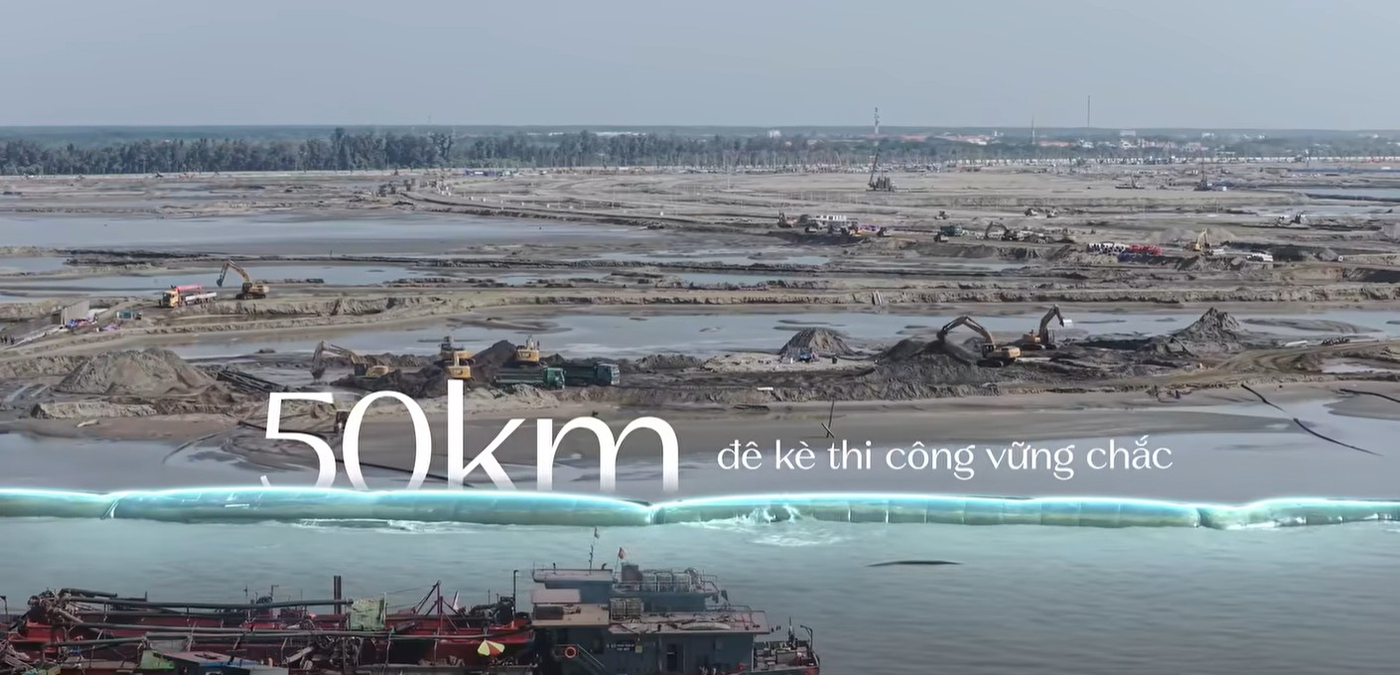 Đến nay, hơn 50km đê kè tại siêu đô thị lấn biển Vinhomes Green Paradise đã được thi công hoàn thiện với độ bền vững chắc. Hệ thống đê này không chỉ đóng vai trò bảo vệ toàn bộ đại đô thị trước tác động của sóng biển mà còn được thiết kế như một tuyến đường dạo bộ ven biển tuyệt đẹp. Việc hoàn thành cột mốc 50km đê kè cho thấy năng lực thi công hạ tầng thủy lợi xuất sắc của các đơn vị thầu, giúp nhà đầu tư hoàn toàn yên tâm về tính an toàn của một dự án tầm cỡ quốc tế.