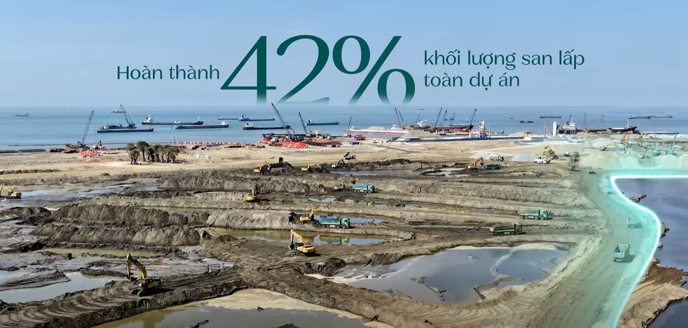 San lấp mặt bằng: Các công tác lấn biển, san lấp mặt bằng, xử lý nền móng đang được thực hiện song song với tiến độ cao.
