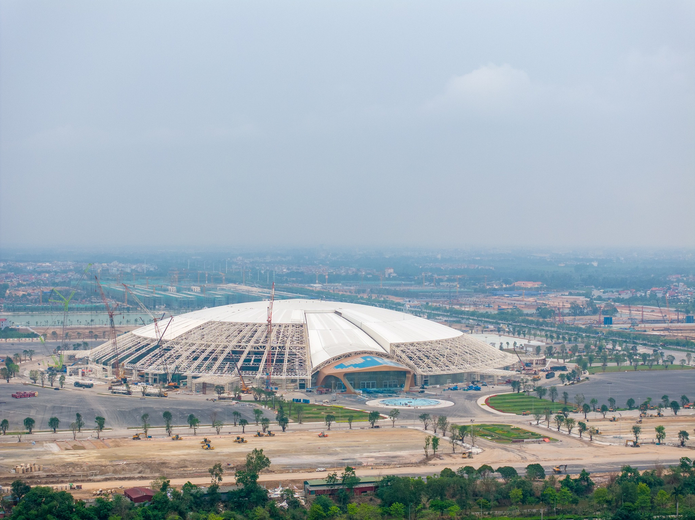 - Hoàn thiện kết cấu và ngoại thất: Các tòa nhà chính phục vụ triển lãm, hội nghị đã cơ bản hoàn thành phần kết cấu mái và bao che. Các hạng mục mặt ngoài, lắp đặt hệ thống kính lớn đang được gấp rút thi công, hé lộ những đường nét kiến trúc tinh tế và quy mô hoành tráng.