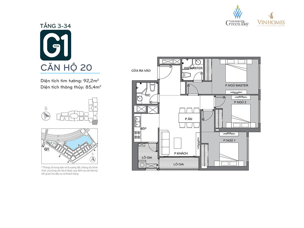 - Căn 3 phòng ngủ: DT 86.4 – 92.2 m2 – Mật độ: 5 căn hộ/mặt sàn