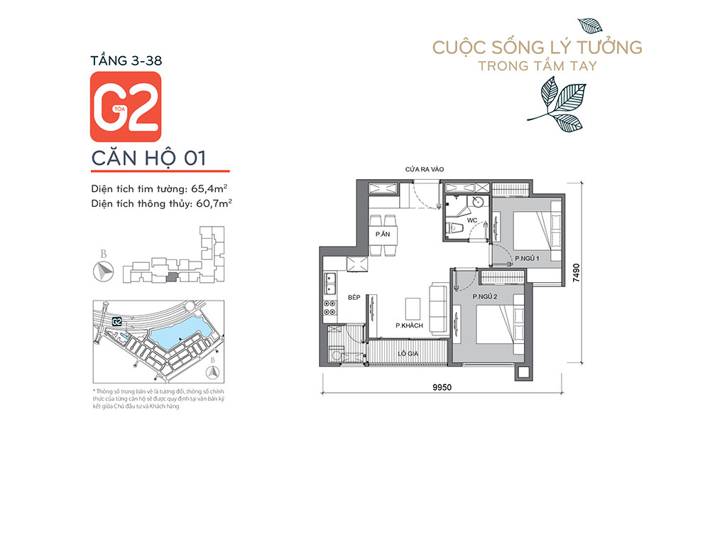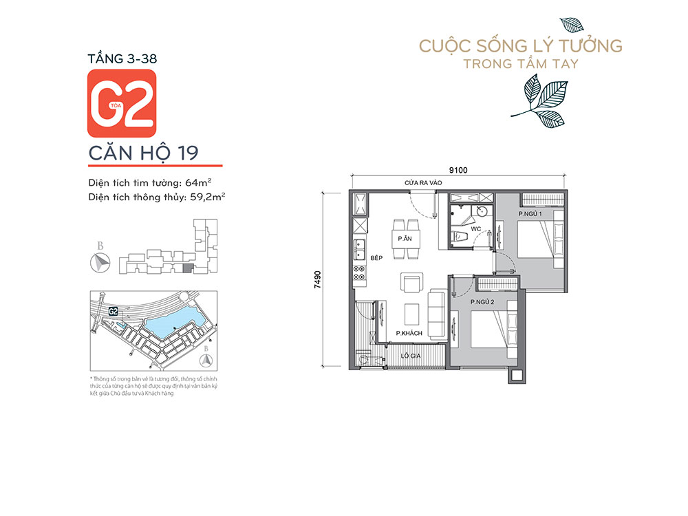 - Căn 2 ngủ : 14căn/sàn với diện tích từ 61,2-72,5m2