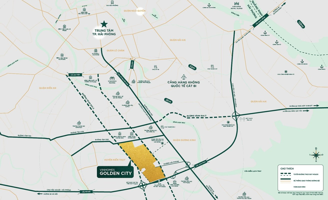 Lợi thế lớn nhất của Vinhomes Golden City nằm ở vị trí “cửa ngõ” phía Đông Nam Hải Phòng, nơi kết nối trực tiếp các trục giao thông trọng điểm của khu vực phía Bắc. Từ đây, cư dân có thể dễ dàng di chuyển đến trung tâm thành phố, sân bay Cát Bi và các khu công nghiệp lớn chỉ trong thời gian ngắn.