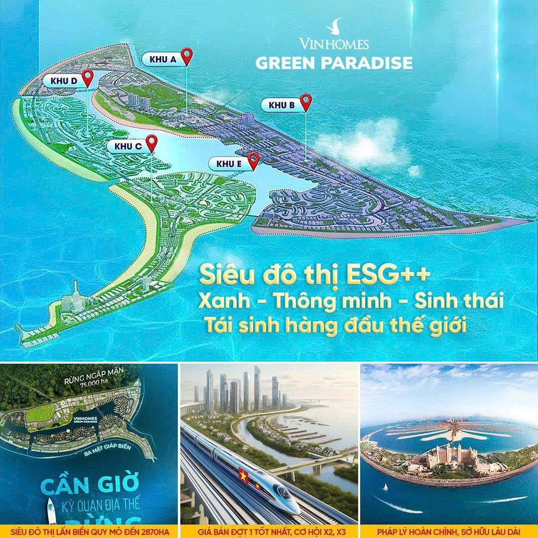 Vinhomes Green Paradise là đại đô thị biển lấn biển quy mô 2.870 ha tại Cần Giờ, TP.HCM, do Vingroup phát triển theo mô hình ESG++ (Xanh - Thông minh - Sinh thái - Tái tạo). Dự án được kỳ vọng trở thành biểu tượng kinh tế biển và du lịch mới của Việt Nam trong thập kỷ tới.
