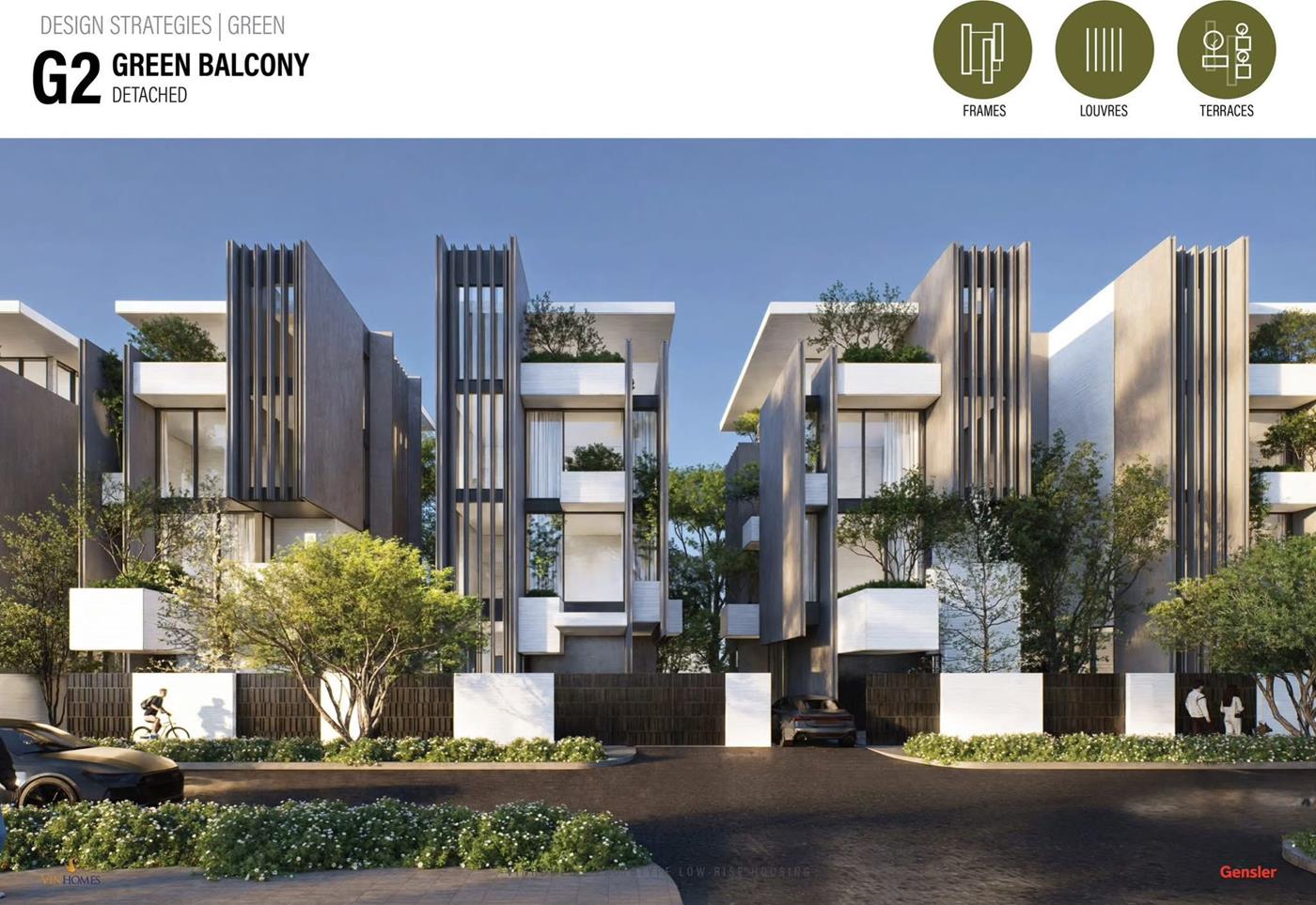 Mỗi căn nhà được phủ kín bởi mảng xanh liên hoàn, từ mái nhà, ban công, tường đứng đến lam che nắng. Những khối kiến trúc hiện đại được “mềm hóa” bằng sắc xanh sinh thái, giúp ánh sáng và gió trời luân chuyển tự nhiên, tạo nên vi khí hậu mát lành và kết nối thị giác trọn vẹn với thiên nhiên.