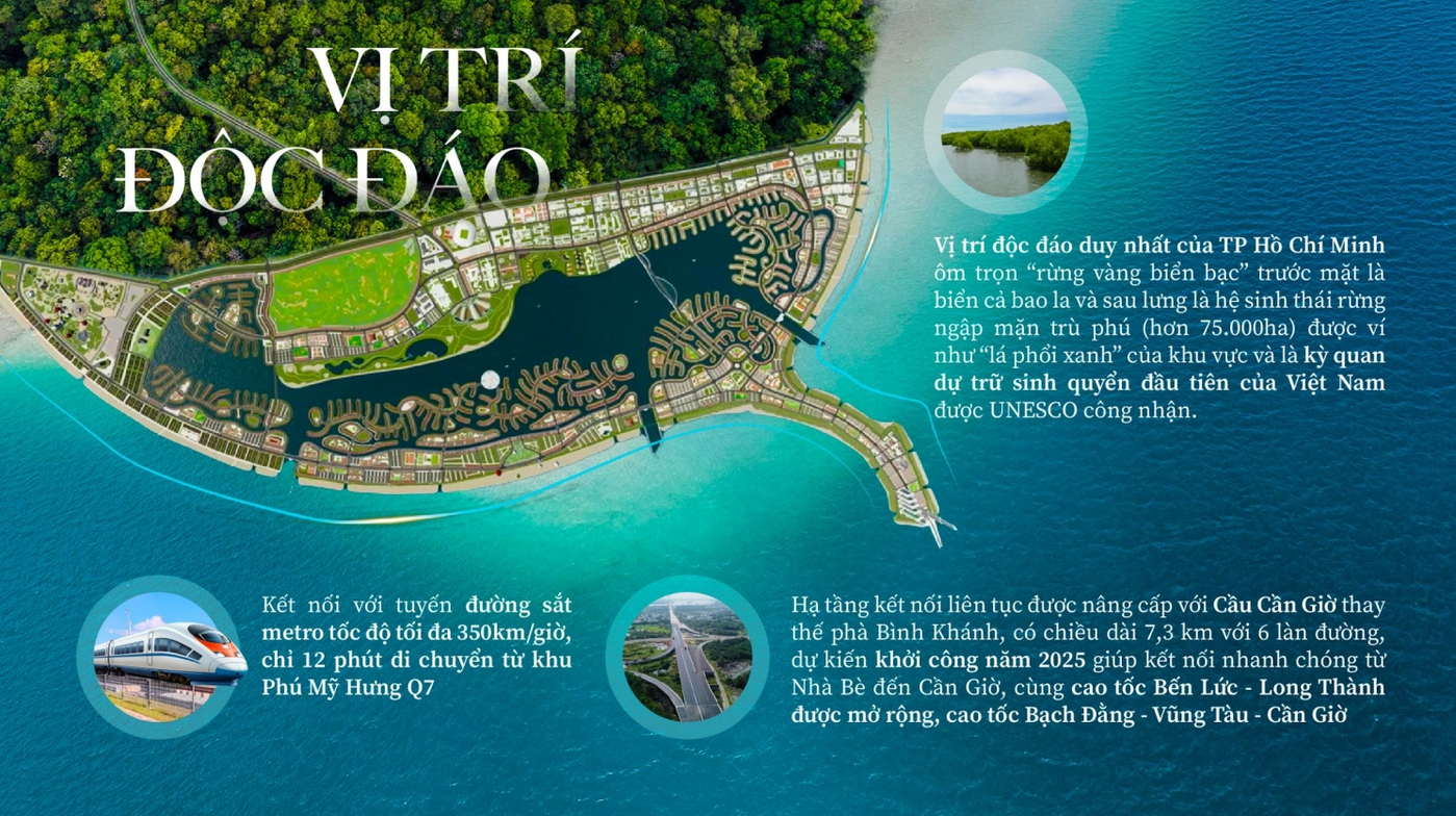 Trước hết, vị trí “cửa ngõ thành phố biển” mang tính độc tôn giúp nguồn cung luôn khan hiếm, đặc biệt trong bối cảnh Cần Giờ được bảo tồn sinh thái nghiêm ngặt. Điều này tạo ra lợi thế lớn về tăng giá dài hạn.