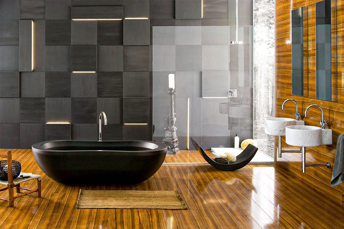 Thiết kế nhà tắm đẹp như Resort sẽ mang đến không gian thư giãn tuyệt vời tại nhà cho các thành viên trong gia đình. Mẫu phòng tắm này thường được sử dụng các tone màu trầm cùng nội thất thiết kế âm tường, đề cao sự thỏai mái và vẻ “sang chảnh”. Đặc biệt, việc sử dụng gỗ công nghiệp chất lượng có độ bền cao trong nhà tắm giúp người dùng hạn chế việc bị trơn trượt và cảm lạnh do thời tiết vào mùa đông.